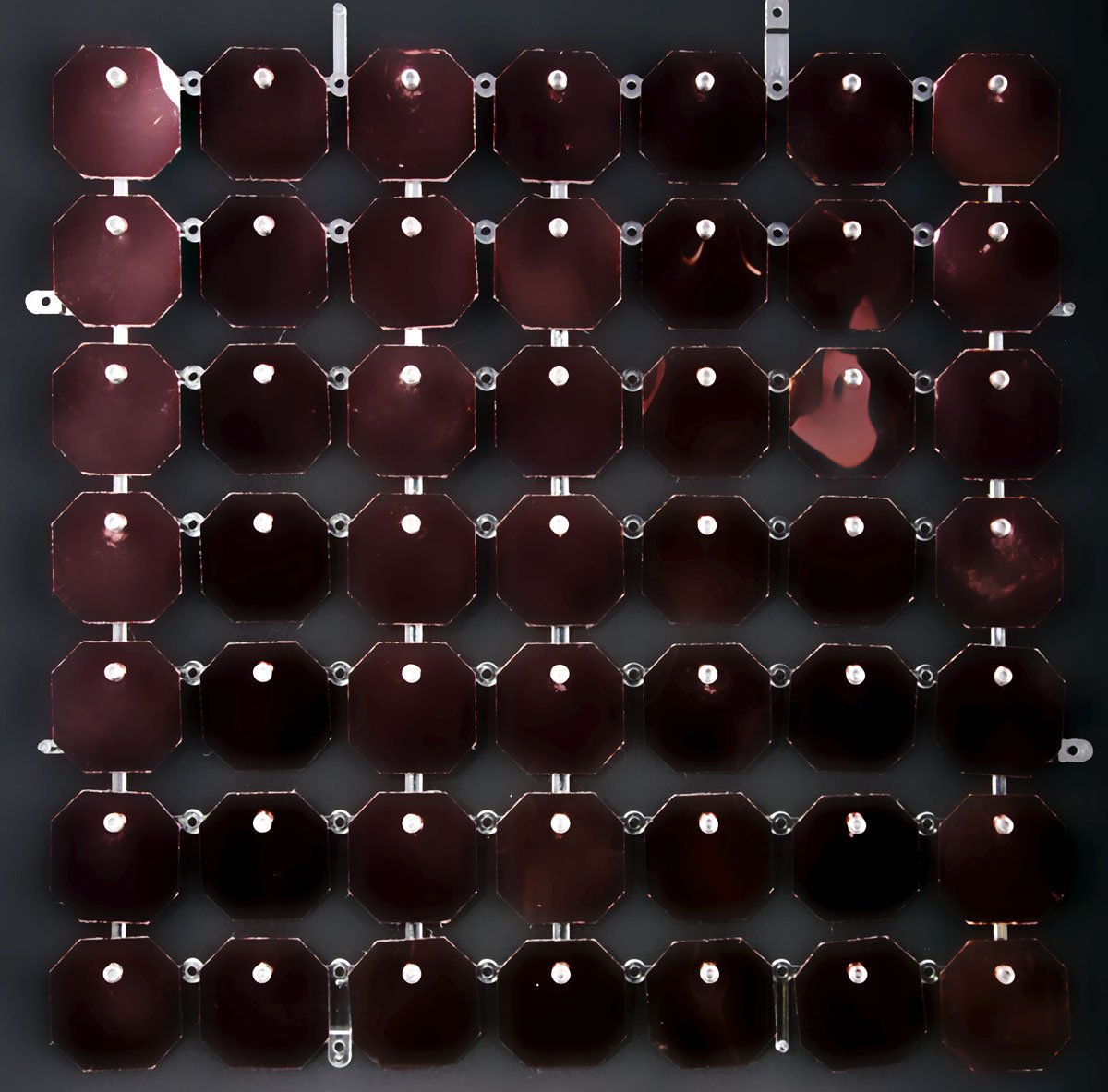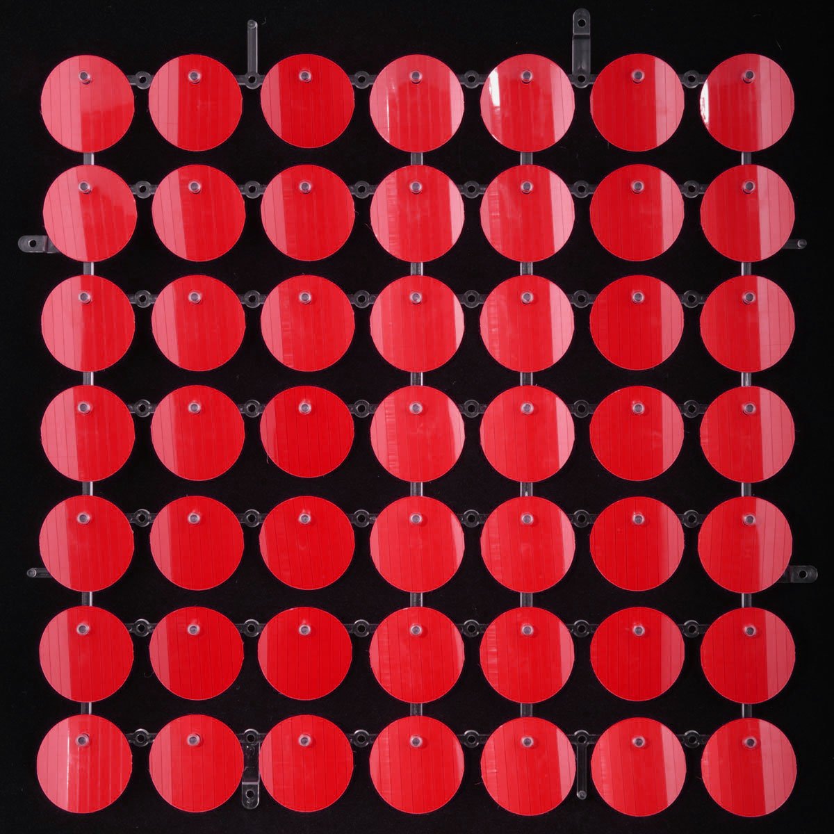 SolaRay® sequin panels are available in two sizes. The larger 1.5 inch diameter SolaRay sequins come 49 sequins/sqft or in 7 rows of 7 discs. The smaller 0.75 inch diameter SolaRay® sequins come 196 sequins/sqft or 14 rows of 14 discs.