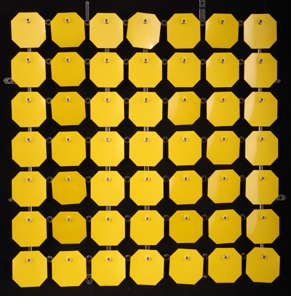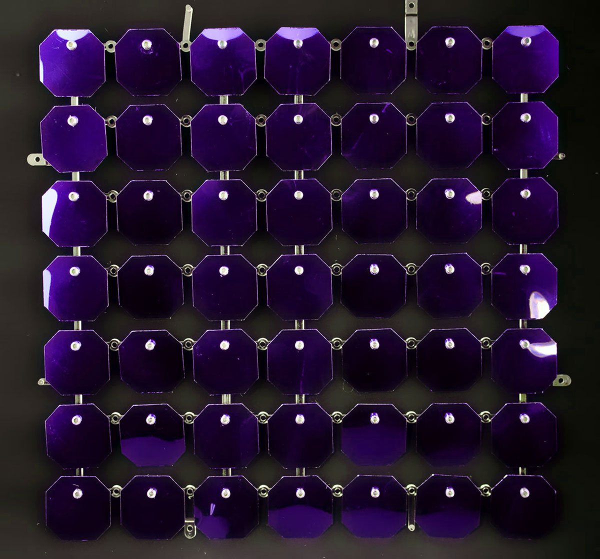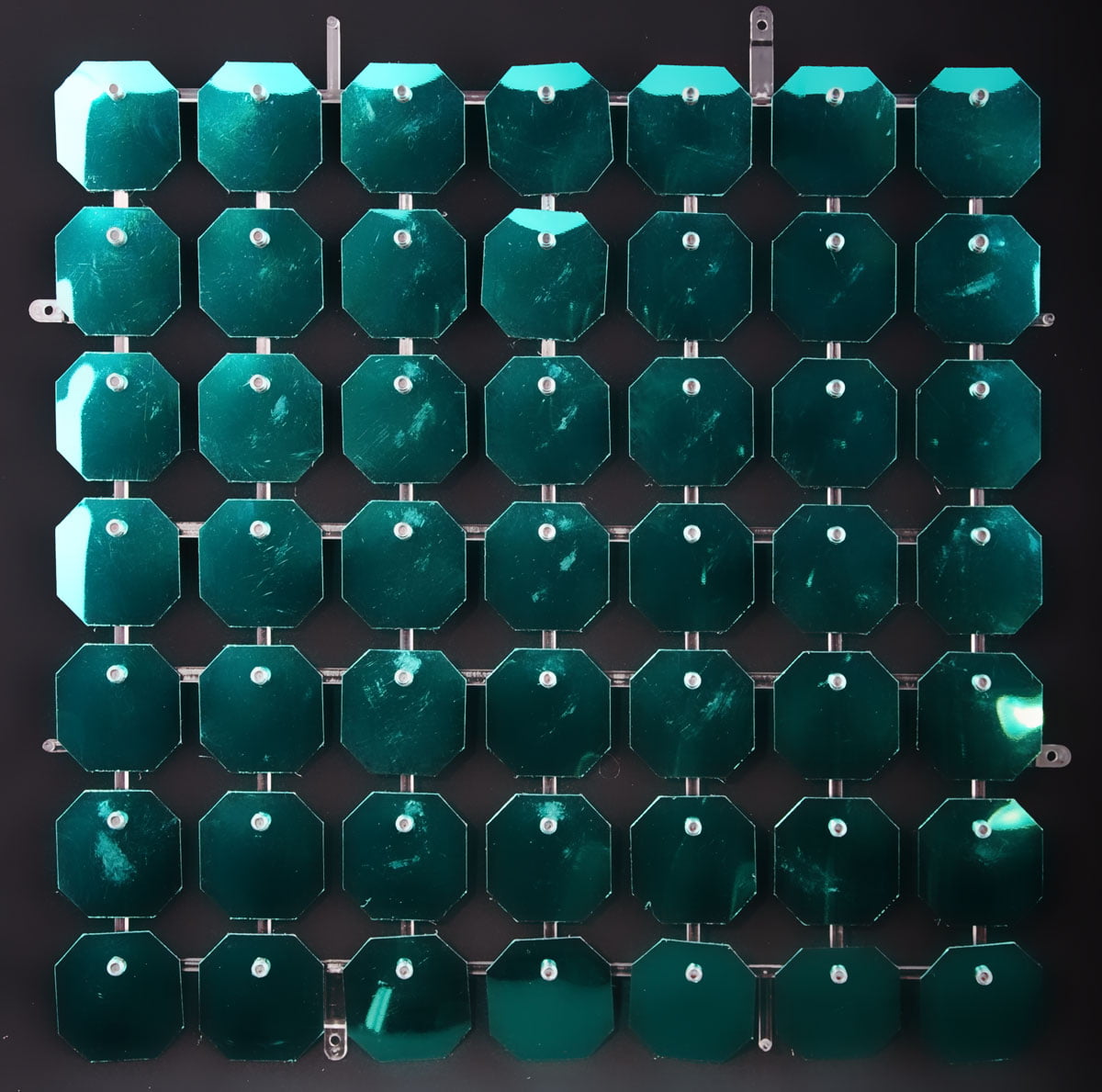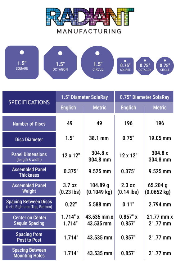 SolaRay® panel sequins are available in three stock shapes, Circles, Octagons and Squares. Circles and Octagons are available in both sequin sizes, the larger 1.5 inch diameter and smaller 0.75 inch diameter SolaRay®. Square shaped sequins are currently only available in our larger 1.5 inch SolaRay®