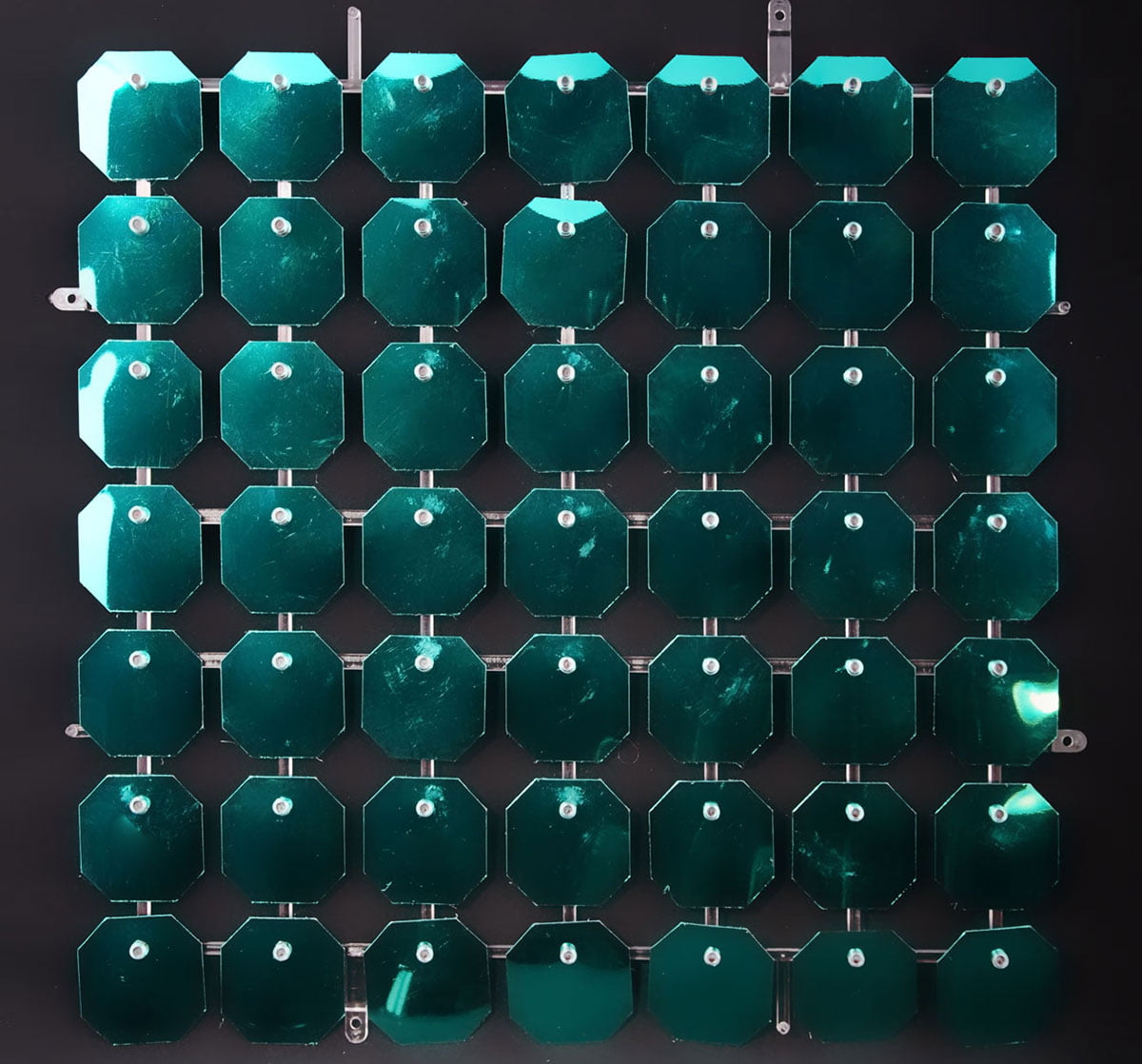 When viewed from long distances the shape of the SolaRay® sequin used in the installation will be irrelevant. The shape will only become visible to onlookers when viewed from less than 50 feet or 15 meters. If your goal is to create maximum coverage with greatest visibility, Octagon sequins will be your ideal solution as the 6 edges provide a slightly greater reflective surface area.