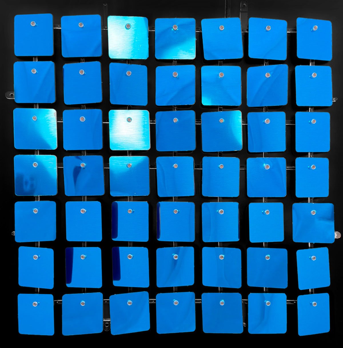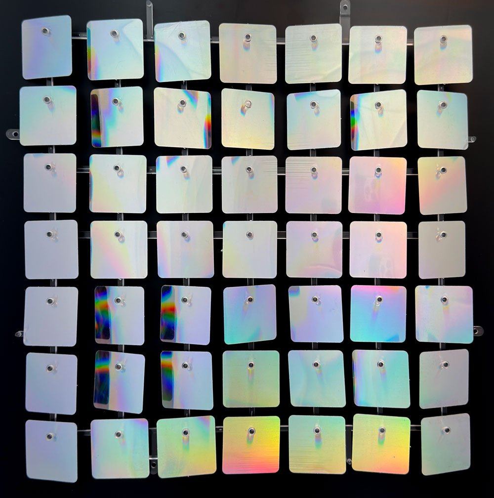 The choice between crimped disk SolaRay sequins and flat disk sequins is yet another way to ensure your SolaRay display is truly custom. The crimped disk sequins create facets to reflect light in prisms, much like a diamond or other cut gemstone would. Flat disks are also reflective, and their design makes them reflect in the direction they are facing. Along with the reflection directions, choosing between crimped and flat disks is often made for aesthetic purposes and contributes to the design of the overall display. For example, most clients opt for flat disc sequins for backdrops that are more likely to be seen up close as they give a smoother finished look.